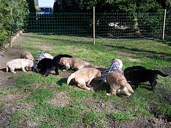 18.07.2010 Unser B-Wurf ist nun komplett in wundervoll passende Familien gezogen, denn auch Buran und Butz sind ausgezogen ihre neue Welten zu erobern. Buran ist bei einer Familie, in der er 24 Stunden am Tag mit seinen Menschen zusammen ist. Buran nimmt am beruflichen Leben seiner Menschen ebenso teil wie am privaten Leben und wird auch auf dem Hundeplatz Unterstützung in seiner Entwicklung erfahren. Butz ist bei Familie Kockel in Erkrath und hat dort sogar noch eine 9-jährige Hovi-Dame - Bente aus Gutem Grund - als Lebenspartnerin. Auch ihn erwartet ein tolles Leben. Butz wird auf dem Hundeplatz gefördert, soll im Hundesport aktiv werden und wenn alles klappt auch in die Zucht gehen. Aus beruflichen Gründen ist Butz ebenso kaum allein und hat seine Menschen beinahe 24 Stunden am Tag um sich. Auch wenn uns der Abschied von den beiden -Butz und Buran- besonders schwer gefallen ist: wir wünschen Euch beiden ein wunderschönes, aufregendes Leben und freuen uns schon auf das Wiedersehen. Damit sind all unsere B-lie's in abslout passende Familien gezogen. Auch wenn es dieses Mal etwas dauern mußte, die richtigen Menschen zu finden, so hat es sich doch gelohnt zu warten, bis auch jede der Knutschmurmeln seine passenden Menschen gefunden hat und nun ein erfülltes und glückliches langes Leben führen kann.