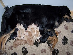 06.03.2010 Der Tag der Geburt Um 13.55 Uhr verließ "Brummel" als erster Dreirutenberger des B-Wurfes sein bisher mütterliches Zuhause und beglückt von nun an diese Welt. Brummel ebnete den Weg für seine Wurfgeschwister und so ging es dann mehr oder weniger "Schlag auf Schlag" weiter. Nach dem Ultraschall und wenn es nach uns gegangen wäre, hätten wir jetzt einen schönen 6-8'er Wurf gehabt und als die nächste Presswehe bei Achtel nach dem 9. Wusel begann sahen wir uns an dachten: Achti: reicht doch. Aber Nein, Achtel legte uns nach der "Wilden 13" des A-Wurfes eine komplette Fußballmannschaft - 11 wunderschöne und kräftige Welpen - in die Wurfkiste. 20.35 kam dann der 11. und letzte "Ruti" des B-Wurfes in unsere Welt. Und wie sehr haben wir uns gefreut, als es am Abend dann in der Wurfkiste gurrte, gluckste, piepte und quietschte. Im Geschlechterkampf hat Achtel eindeutig gegen Bilbo verloren, denn 8 Rüden zu 3 Hündinnen sind gerade im Hinblick auf den Frauentag wohl eher fraktionsschwach. Achtel hat ihre Aufgaben von den Presswehen bis zum ersten Säugen wieder sehr ernst genommen. Einige der Tücher für den Triebstau landeten ordentlich von Achtel zerrissen im Müll, alle Baby's wurden von ihr selbst abgenabelt und entpackt, sauber und trocken geputzt und herzlich in Empfang genommen. Sie hat alles mit einem glücklichen, wissenden und breiten Lächeln kommentiert. Der Blick in Achtels Augen war für uns wieder herzerweichend schön. Nun heißt es also wieder Nachtschicht schieben und mal schauen, was die Tage und Nächte uns so bringen |