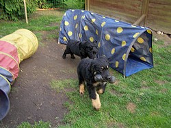 05.04.2010 Unsere Wusels sind am Wochenende ins Welpenhaus umgezogen und haben eine große, komfortable und helle Luxusvilla, die ihnen gestatten wird, sich artgerecht zu entwickeln. In Windeseile und mit tatkräftiger Hilfe von Familie Weber aus Coburg (Familie von Ajushi aus unserem A-Wurf), haben wir alles hergerichtet, den Welpenspielplatz aufgebaut und los ging es. Das Welpenhaus wurde mit großer Freude und einem ungeahnten Bewegungsdrang angenommen. Der erste Kontakt mit dem Welpenspielplatz war für uns faszinierend, denn alle stürzten sich durch die Tunnel, ranntzen durch die hängenden Dosen und inspizierten schon mal das Welpenklettergerüst. Absolut unbeeindruckt und mit Forschereigenschaften. Die Knutschmurmeln sind jetzt 4 Wochen alt und haben sich innerhalb von wenigen Tagen zu erkennbaren kleinen Persönlichkeiten entwickelt, die sich sehen lassen können. Wir haben jede Menge berufliche Qualifikationen bei ihnen festgestellt. Alle sind im Wasserstraßenbau tätig, denn es fließen Seen und Bäche, wenn sie nach dem Wachwerden ihrem diesbezüglichen Geschäftssinn nachgehen. Sie sind äußerst flink darin und wenn 11 Welpen da loslegen, kommen wir kaum mehr hinterher. Kaum haben wir die Fluten eingedämmt, folgen wilde Rennereien der Wackelbäuche, denn sie sind auch in der Abfallbeseitigung tätig und legen uns beinahe riesige Hinterlassenschaften zur Beseitigung vor. Nach einer kurzen Eingewöhnungszeit werden sie freien Zugang zum Welpenauslauf haben, so daß dann schon mal eine gewisse Stubenreinheit zu erkennen sein wird. Das wäre auch gut so, denn: unsere Waschmaschine läuft jetzt im 24-Stunden-Takt und stöhnt manchmal schon recht ordentlich. Unsere Fingerkuppen sind vom Putzen beinahe nicht mehr zu fühlen und das mit dem Schlaf, das holen wir irgendwann mal nach. Aber mittlerweilen sind beinahe alle absolut fit, nehmen nach wie vor kräftig zu, weil sie ja wirklich richtig große Hovawarte werden wollen und fressen absolut gut. Egal was wir anbieten, ob Flocke oder Kroketten, alles wird aufgeputzt. Langsam tasten wir uns auch an Tatar und andere leckere östlichkeiten heran. Achtel darf nun endlich auch wieder zu ihren Welpen und eine schreckliche Zeit des Aushaltens für sie ist vorbei. Sie putzt und spielt mit den Kleinen und bietet umgehend wieder eine Milchbar an, die gar nicht mehr da ist. Wenn sie alle kleinen Glücksbringer dann untersucht und geputzt oder auch schon mal erzogen hat, hat sie jedoch auch schon mal genug von dem Gewusel und zieht sich entspannt zurück. Alle 11 sind absolut spielverrrückt, aber sie "küssen " auch gerne. Wenn wir uns zu ihnen in die Körbchen oder auf den Boden setzen, werden wir ordentlich begrüßt, geküst und mittlerweilen auch schon mal recht kräftig angenagt. Spielzeug wird durch die Gegend geschleppt und geschüttelt, bis es scheinbar keinen Ton mehr von sich gibt und man zergelt auch schon mal mit den Geschwistern, wobei es hier mehr um Eroberungskämpfe geht, als um Tauziehen. Insgesamt sind alle recht temperamentvoll, verspielt, neugierig und natürlich zuckersüß. Jetzt, wo wir mehr Zeit haben uns mit den Pelznasen wirklich zu beschäftigen, gehen wir mit einem Lächeln schlafen, denn es sind so viele Momente, die einen wirklich alles andere vergessen lassen, so daß man nicht nur lächelt, sondern auch tiefe Freude empfindet. Alle 11 sind einfach knuffig und haben super Anlagen, soweit man das jetzt schon beurteilen kann. Und wir sind froh, das es sie gibt!!!