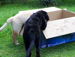 11.06.2010 Immer noch voller Geduld, daß sich bald die passenden Familien für unsere beiden Wonneproppen finden , lernen, toben uns spielen die kleinen Süßen für ihr weiteres Leben. Die Witterungsbedingungen verlangen geradezu nach sehr viel "Wassersport" und unsere beiden süßen "Wasserratten" - wie wir sie liebevoll nennen -, können davon ja nie genug haben. Mehr jedoch bringt ihnen das gemeinsame Spiel.. Butz festigt seinen herrlich ausgeglichenen Charakter, indem er Buran einfach gewähren läßt. Wird es ihm zu bunt, rennt er ihn einfach mit seinem Körpergewicht um und freut sich wie ein kleiner König, wenn Buran dann liegt. Buran hingegen ist ein Steh-Auf-Männchen und läßt sich davon selten abhalten, Butz zum Toben, Jagen und Rennen aufzufordern. Jezt, wo es so heiß geworden ist, macht es kaum Sinn für die kleinen Strolche, groß mit dem Auto los zu fahren. Also müssen wir improvisieren, denn lernen, lernen und nochmals lernen darf nicht vernachlässigt werden. Also nutzen wir jede noch so kleine Möglichkeit und suchen Herausforderungen für die beiden. Ob es das Laufen an Einkaufsgelegenheiten ist, die Bekanntschaft mit echten Landschaftsgärtnern, Motorrädern, LKW's und so weiter. Natürlich gehört jedes Mal das Laufen an der Leine dazu. Auch der Besuch auf dem Hundeplatz, wurde absolviert, wo man Schwester Benika wieder traf. Nach sehr wilden Tobereien blieb aber auch hier der Lerneffekt nicht auf der Strecke. Unsere beiden Knuddels sind nicht nur ausgesprochen süß, sie entwickeln sich zu wirklich tollen und taffen Hovi-Kindern. Sie sind immer und für alles zu haben, sind nie ängstlich, immer neugierig und freudig bei der Sache. Das erste Fährten war große Klasse. Als ob sie dies schon immer getan hätten, wird schon ziemlich lang konzentriert der Spur gefolgt und Futter aufgenommen. Die Spiele werden schneller und einfallsreicher und die Neugier ist stets in Bereitschaft. Bleibt uns also nur abzuwarten, bis die wirklich passenden Familien sich melden und auch diese beiden den Sonnenschein in anderer Menschen Leben bringen dürfen. |