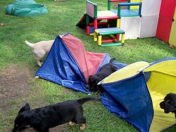 03.09.2011 Mittlerweilen wachsen und gedeihen unsere kleinen Strolche beinahe stündlich. Wir sind mit den Gewichten sehr zufrieden und auch sonst ist unser kleiner Achter sehr sehr "pflegeleicht". Unser Welpentunnel im Auslauf hat neben vielen anderen kleinen und großen Spielzeugen zwar ordentlich gelitten, weil er als Hüpfburg umfunktioniert wurde, aber die Spielfreude ist unbeschreiblich und so soll es sein. Alle 8 können ganz genüßlich neben oder aneinander gekuschelt liegen, den tollen getrockneten Pansen z.B. knabbern und kein Geschwisterchen wird hektisch oder versucht dem anderen etwas weg zu nehmen. Dies liegt nicht daran, daß sie satt wären oder es nicht schmecken würde. Ganz klar herrscht kaum Futterneid untereinander, was wir auf die tolle Versorgung von Anju zurückführen, sie sooo lange gesäugt hat. Unsere Wusels haben jeden Tag jede Menge Besuch. Die Ausflüge erweitern sich ebenfalls jeden Tag. Das Autofahren ist vorbereitet, alle haben schon im Auto gesessen und nun kann heute oder morgen die erste Fahrt stattfinden. Der Auslauf entspricht in manchen Ecken einer Kraterlandschaft. Und fleißig wie die Süßen sind, kaum hat man ein Erdloch wieder zugeschüttet und auch festgetreten, bringt die Werkzeuge hierfür weg und kommt wieder, schon sitzt ein Hovikind da, buddelt erneut und macht es noch besser, tiefer und schneller als vorher. Wir haben es also aufgegeben, Löcher zu stopfen und schauen lieber dieser penetranten Buddelei zu. Die Nächte hier waren jetzt schon ziemlich kalt, was Welpe dazu bewegt, so ab 20.30 schon mal ins Welpenhaus zu gehen und sich einen schönen gemütlichen Platz zum Schlafen zu sichern. So rufen wir die Wusels also nochmals zur letzten Mahlzeit und dann nochmals gegen 22.00Uhr zum Mien'chen-Legung und Stausee-Errichtung. Danach fallen die Kleinen regelrecht um und schlafen schon beinahe durch. Gegen 6.00 Uhr morgens, wenn die Tür geöffnet wird, sehen uns kleine süße Welpenaugen noch ganz verschlafen an, Welpe rekelt sich und kommt dann streckend aus dem Haus. Dann steppt hier jedoch der Bär. Jeder will allein begrüßt werden und die Aufmerksamkeit, die gerade Bruder oder Schwester erhält. Es ist dabei nicht leicht die Süßen auszutrick'sen, schnell ins Welpenhaus zu gelangen, um mit der ersten Reinigung zu beginnen. Die Truppe teilt sich dann gerne in 2 Teams und jeweils eines rennt zu den beiden Türen, in der Hoffnung beim Wischen helfen zu können oder das übliche Schrubbersurfen nicht zu verpassen. Anju findet ihre Kinder zwar noch ganz nett, aber alle auf einmal läßt sie schon mal verzweifeln. Die Wusels sind mittlerweilen so schnell, daß sie kaum noch alle im Auge behalten kann, was sie ziemlich stört. Dennoch tobt sie vor ihren Kindern immer mal wieder absolut ab, so als ob sie zeigen möchte, was man später mal drauf haben wird. Wir haben nette neue Familien für 6 unserer Baby's gefunden. es können zwar nicht alle pünktlich zur Abgabe abgeholt werden, aber es erwartet sie ein sehr schönes aufregendes und liebevolles Leben. Nun suchen wir noch für unser Clärchen und für unsere Caprice Menschen, die sich diese tollen Hunde in Ihr Leben wünschen und auch bereit sind das schöne Temperament zu fordern und zu fördern. |