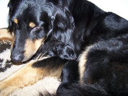 13.07.2011, der Tag der Geburt Nach nur 3 kräftigen Presswehen von Anju, "rutschte" Calito um 06.30 Uhr, der erste des C-Wurfes, mit seinen 550 Gramm als schwarzmarkener Rüde in dieses Leben. Unsere süße Anju schaute nicht schlecht, was da so in ihr steckte und letztlich in der Wurfkiste piepte und quietschte. Calito hat mit eisernem Willen den Weg für die weiteren C-lie's geebnet. Im Gegensatz zum A- und B-Wurf hat Anju die "Frauenquote" beinahe wieder ins Lot gebracht, denn 5 Hovimädels gegenüber 3 Hovirüden ist was für unsere Frauenpower. Dafür hat Anju es aber dann wirklich spannend gemacht. Der letzte kleine Drei-Ruten-Berger verließ erst um 18.30 die mütterliche Bruthöhle. Ein schwarzmarkenes Mädchen, das scheinbar einen sehr weiten Weg durch die Uterushörner nehmen mußte und deshalb von uns den namen Crossi verliehen bekommt. Außerdem sieht Crossi aus wie ihre Mutter und wir fanden schon immer, unser "Springinsfeld" Anju sollte eine ihr ähnliche Tochter mit Namen Crossi haben. Unser Wunsch, das wenigstens Anju einen anzahltechnisch stressfreieren Wurf haben möge als unsere Achtel wurde erfüllt, aber am wichtigsten, alle 8 Pelzknäule sind gesund, munter, propper und : natürlich wunderschön. Anju stand ihrer Mutter in nichts nach und so wurden auch dieses Mal wieder so einige Laken und Tücher die sie während der Geburt feinsäuberlich filetierte Füllmaterial für die Mülltonne. Anju hat sich wacker geschlagen, selbst alle Welpen ausgepackt, abgenabelt, sauber und trocken geleckt, als ob sie das schon immer getan hätte. Am Faszinierndsten für Anju war, das diese kleinen Schnurpels so merkwürdige Geräusche von sich gaben. Anju drehte bei jedem Laut den ganzen Tag immer wieder völlig konfus den Kopf , hielt den Atem an und lauschte. Wir kamen nicht ums Schmunzeln herum, wenn sie wieder aufsaß, den Kopf bis zum Anschlag nach rechts und links drehte und ihren Kindern zuhörte. Nun ist unser eigenes Hundekind also Mutter geworden und wir sind unheimlich stolz auf Anju, sie macht das einfach super toll und es ist süß anzusehen. Sie ist etwas erschöpft, aber erholt sich recht gut. Und jetzt murmelt, grunzt, piepst und schmatzt es wieder in unserer Wurfkiste und wir können uns garnicht satt sehen, an diesen kleinen "Knautschkes" |